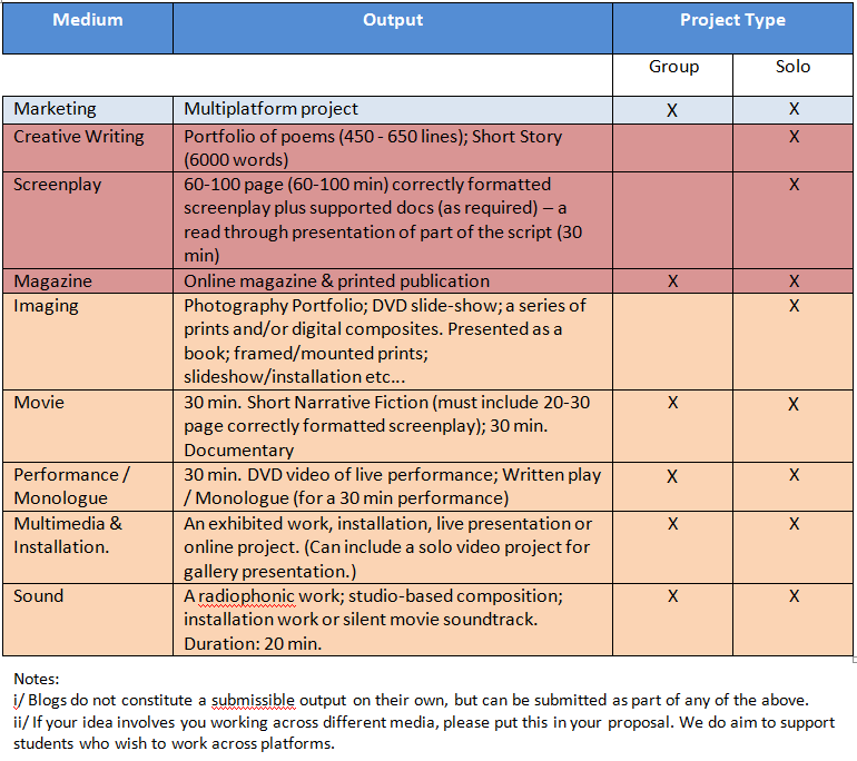 The course provides a foundation for students embarking on a self‐directed process of study, research and practice leading to a practice-based output in one of a number of mediated forms supported by the department (see below). During the first term the student is required to submit a proposal for either a group or solo project, depending on the project. A significant feature of the course is that once the student's proposed area of activity has been agreed, they are mentored in working towards their goal through regular focused tutorials with a staff member who has experience in that area. The course also consists of a series of lectures and workshops designed to support and inform the student in their approach to practice-based research across the spectrum of disciplines represented by the department.